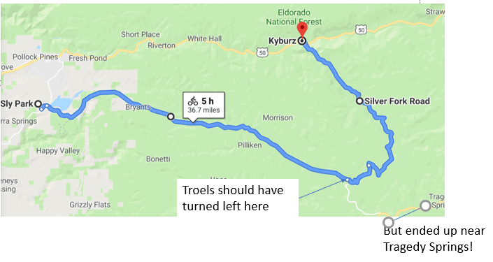As mentioned we went in a nice straight line from Folsom to Placerville. We thought our GPS had told us to cross Route 50, which is the shortest route to South Lake Tahoe, but at this point it is too much freeway to allow bicycles on it. It was our impression that we should stay close and then when 50 would let us in, we would take this road. After our pancakes, however, we were advised to take another route leading and suddenly we found ourselves far away from 50 at a at a small recreational area Sly Park at a lake called Jenkinson lake. We did not think that we had done enough for the day and we started to look for hotels, which could become Saturday’s goal. It was hard to find anything, so we were luckythat the Sierra Inn in Kyburz had a room. We booked a room and started riding on a beautiful road called “Mormon Emigrant Trail”. We thought that we had 1000 m as total ascent (I am not sure about the terminology here, but we will use “Total Ascent” as the number of vertical meters you have gone up on a day’s ride and “Climb” as the number of meters you have elevated yourself on a ride. If it goes up down and up on a ride, total ascent will be higher than the climb) but must have mistaken total ascent and climb. After only a few miles, Troels began to suffer from some serious muscle cramps and though he was brave it quickly became clear that he needed to rest, slow down and get more energy. After another while it became clear, that we were probably not going to make it to Kyburz before dusk, so what to do? Split up or just hope for some downhill stretches, where we could advance faster and at least get to our hotel not too late? We developed the cunning plan, that I should ride to the hotel and see what Troels had ahead of him and possibly get some rescue. I climbed to 2300 meters, but after 10 kilometers I should turn left on a Silver Fork Road which happened to be downhill down to Kyburz in 1250 meters. Good for Troels I thought, he would only have to endure the first 10 kilometers to Silver Fork Road, turn left and go mostly downhill. Bad for our itinerary, as the loss of more than 1000 meters of elevation hurt my heart, because we will just have to recover those meters tomorrow. The agreement was that I should call Troels, when I got to the hotel. I missed his call by a few minutes, while checking in and asking whether, I could borrow or rent a pick-up truck. When I tried to call back, there was no cell phone service and when Alfonso from the Sierra Inn offered to take me with him up Silver Fork Road to meet Troels, I just quickly accepted and went with Alfonso in his Toyota. No Troels even though we went all the way till where I had left him. Alfonso and I quickly agreed that he had been picked up and I felt sorry that I had taken more than an hour of his time and 75 kilometers in his truck.. Kyburz is just three four houses along Route 50, and Alfonso even took me to a gas station to buy a little liquid and some food. I did not get his last name, but for the rest of this story he is just Alfonso Goodheart, with the middle name “Patience”.